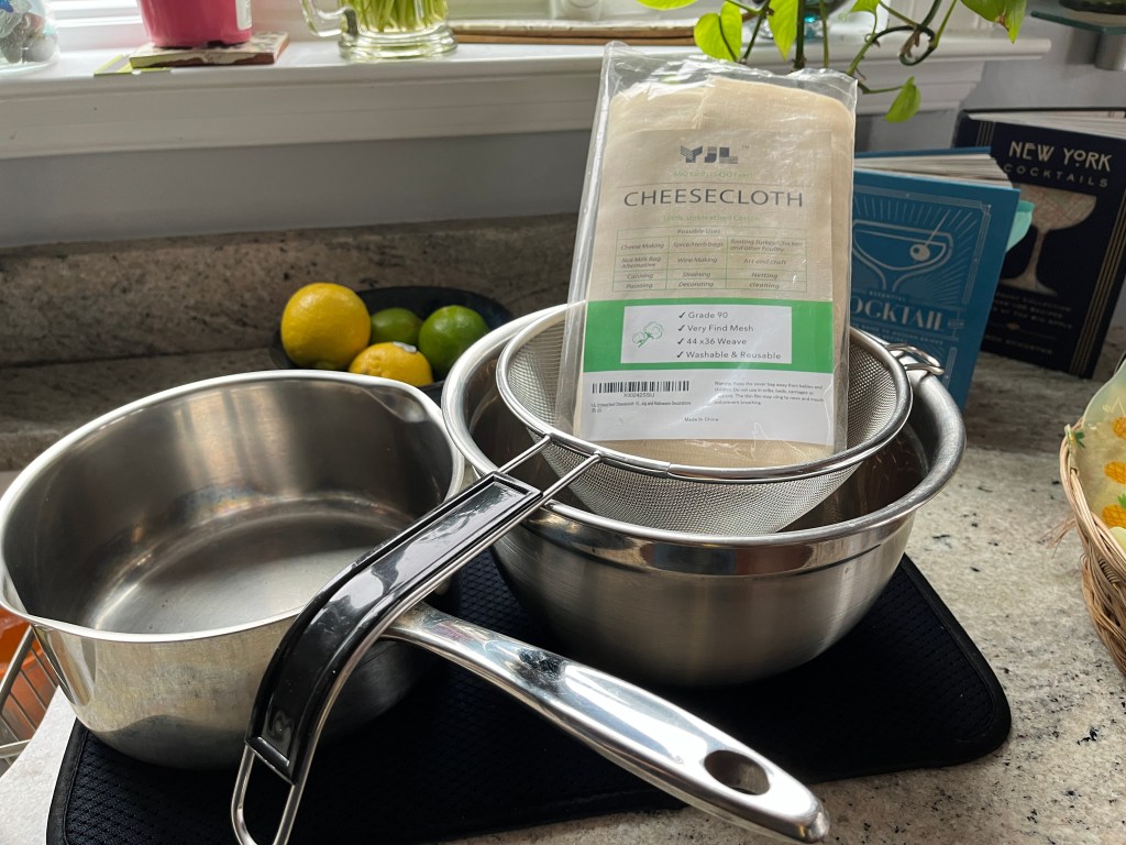 - Bowl large enough that strainer can sit on with enough room for whey [the liquid remaining after milk has been curdled and strained to drain]