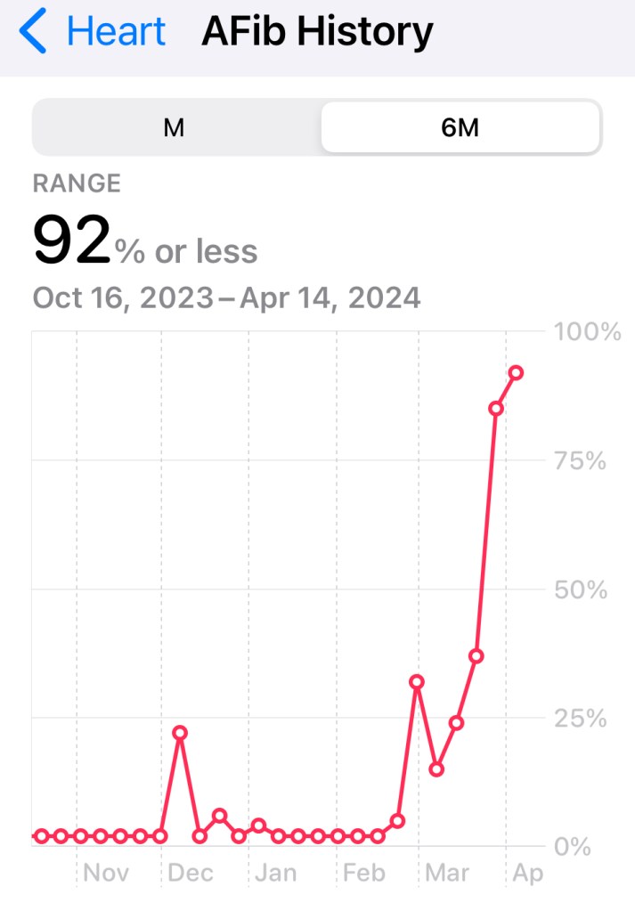 Since the TAVR procedure on February 21 my Afib has gotten worse each week. The numbers now indicate I am in Afib over 90% of the time. It is exhausting. So as my blood flows more freely through my new heart valve, my Afib feels free to exert itself more vehemently. I have no other way to think of this.