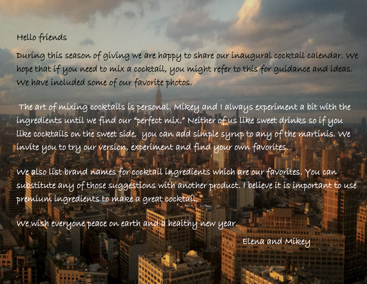 I am delighted to let you know I’m adding a recipe/cocktail section to my website. I would be remiss if I didn’t share the original 2013 Cocktail calendar that I created for colleagues, clients, friends and family. Each month was meant to be a story of the cocktail, the place and the mixologist who created it. Although some of the bartenders, restaurants and cocktails might be dated, they are still delicious, and if we know anything from history, they all will come back into vogue.