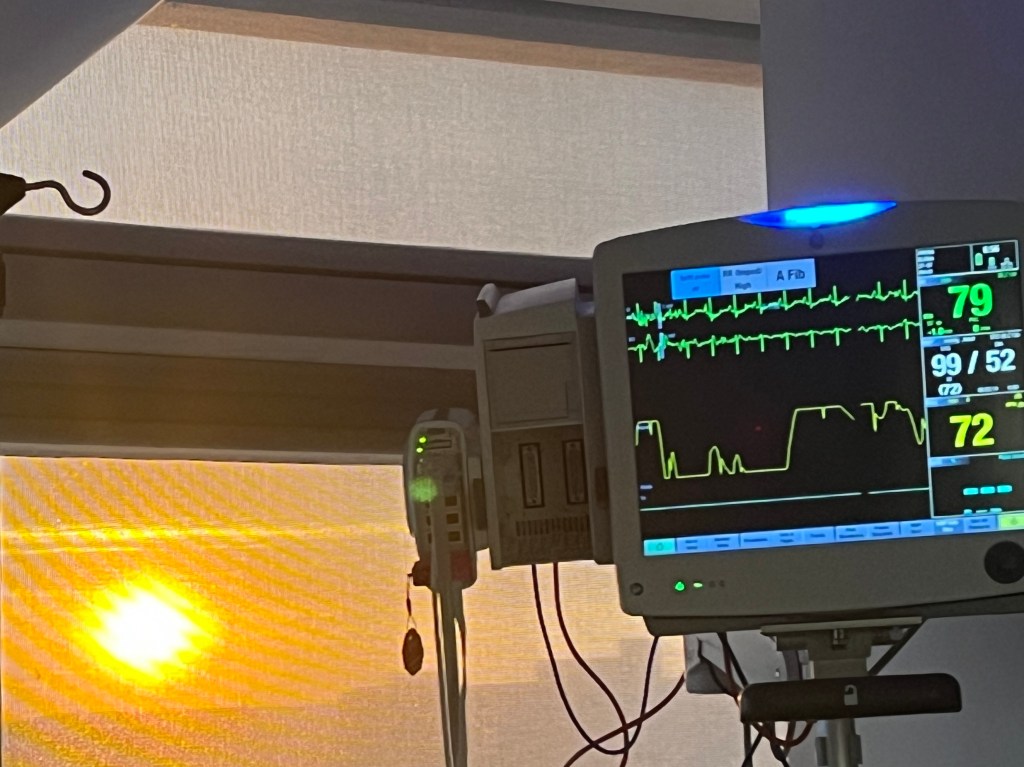 The night passed slowly but I was happy when the sun rose and I could get up by myself and walk a bit without calling anyone. The monitor was registering everything: blood pressure, oxygen levels, heart beats, PVC, and Afib. I find it comforting that someone is watching all those numbers at the nurses desk. When you get home, no one is watching that and I am always aware of that fact.